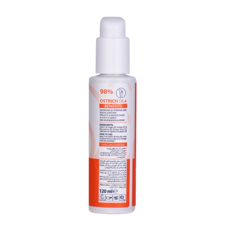 روغن شترمرغ تراست 120 میل کمک به درمان بیماریهای پوستی مانند خارش، بریدگی، سوختگی سطحی یا ناشی از آفتاب، اگزما، پسوریازیس و زخم بستر