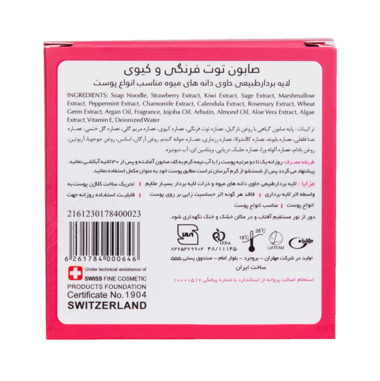 در این محصول جهت اثرگذاری بهتر و بیشتر، ضمن داشتن حس طراوت و شادابی در پوست، از عصارههای خالص توت فرنگی و کیوی کمپانی سیمرایس کشور آلمان به صورت اکستراپن استفاده شده است. ذرات لایه بردار گیاهی در این صابون به گونهای انتخاب شده که لایه برداری ملایمی را بر روی پوست انجام داده به همین دلیل قابلیت استفاده روزانه را داشته و بعد از 2 هفته استفاده، موجب روشن شدن و ایجاد احساس شادابی و جوانی در پوست میشود.