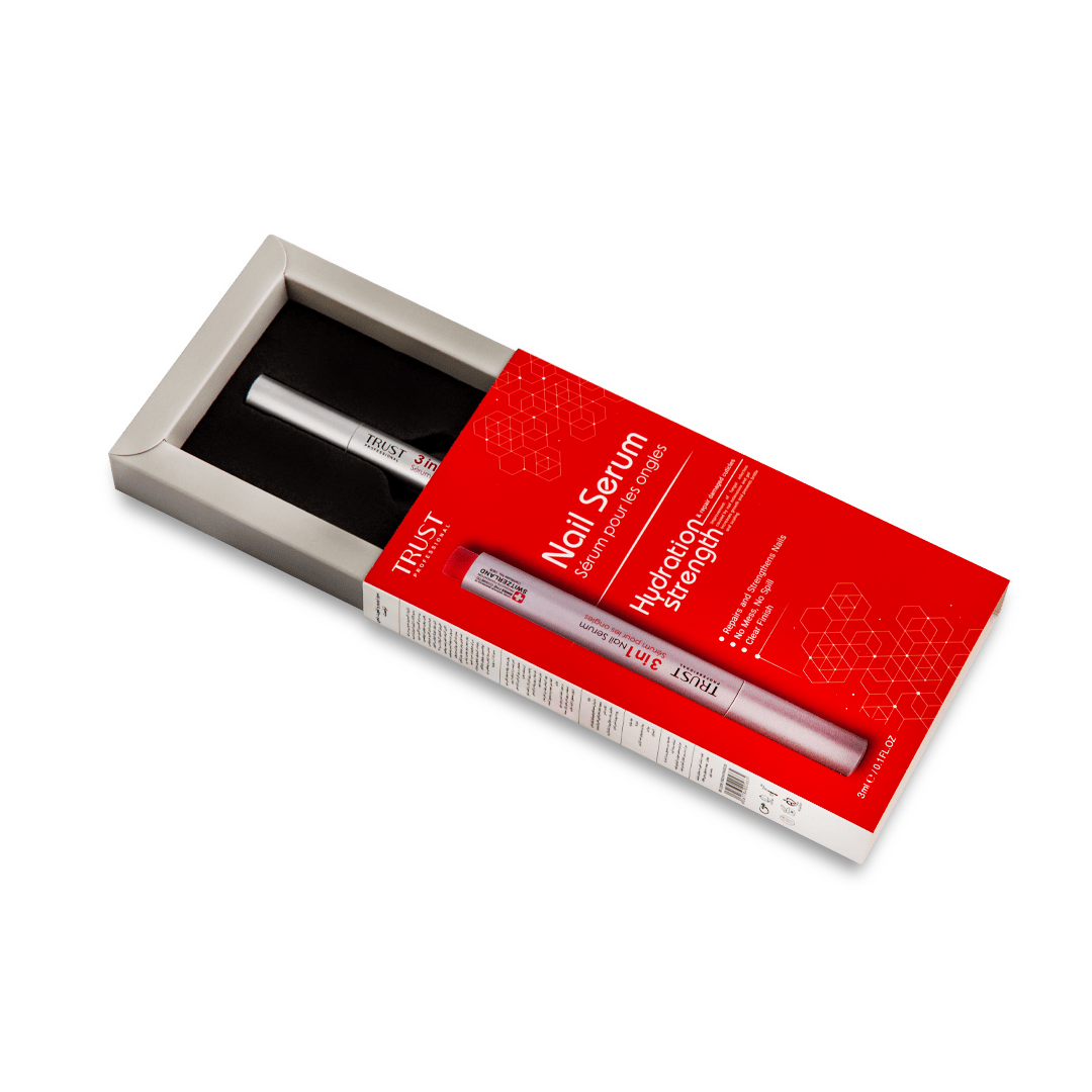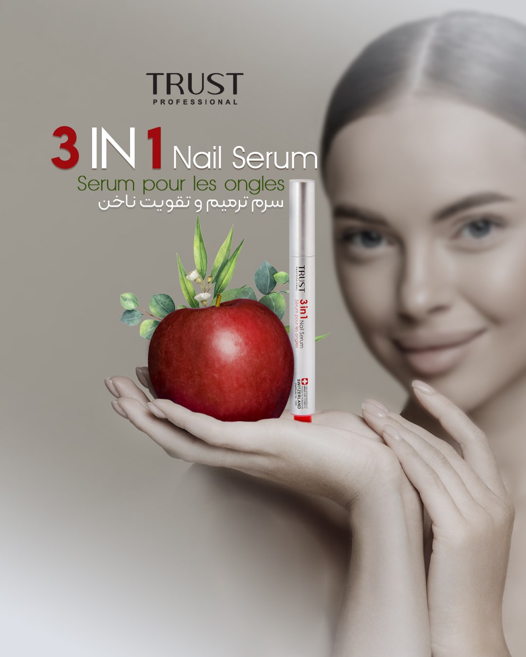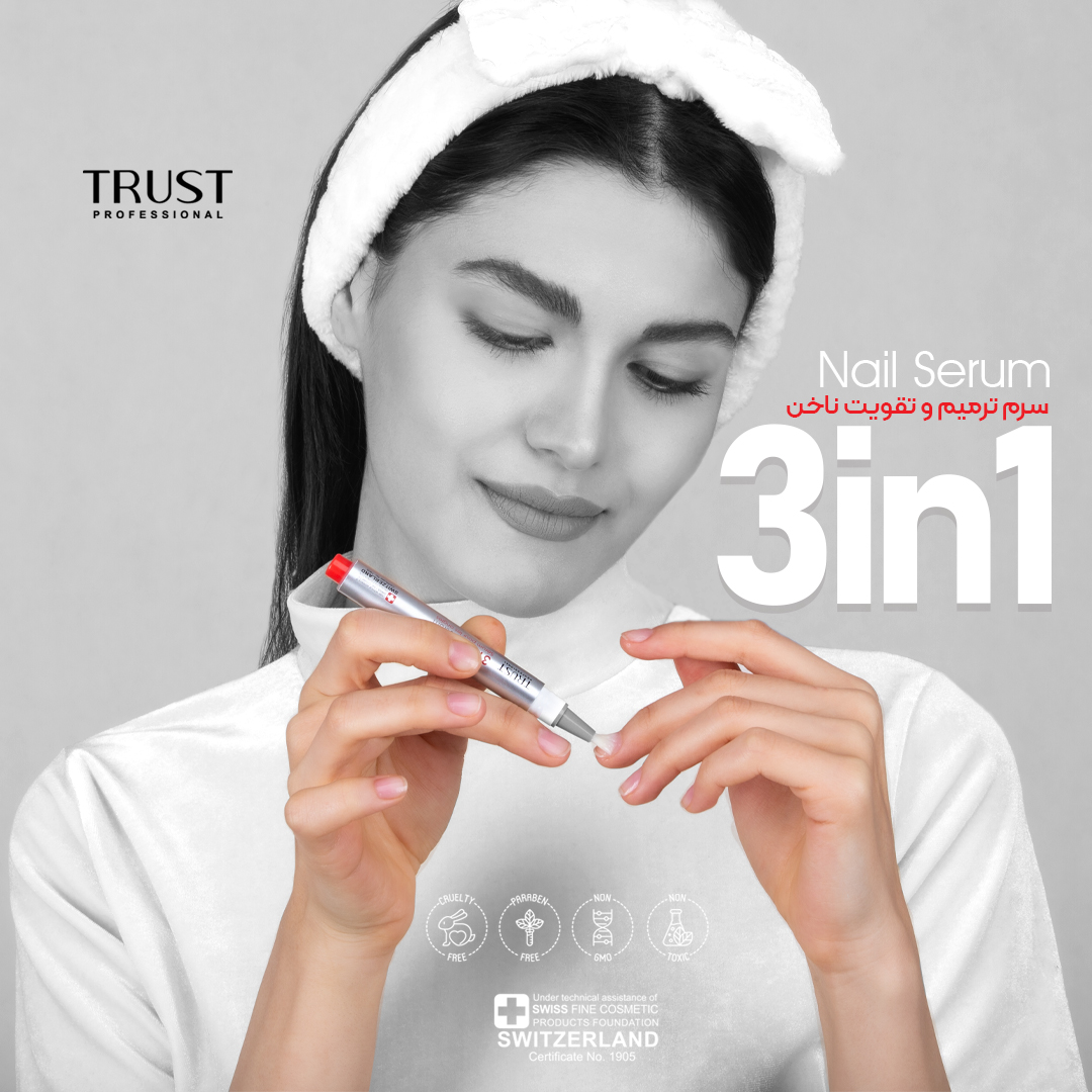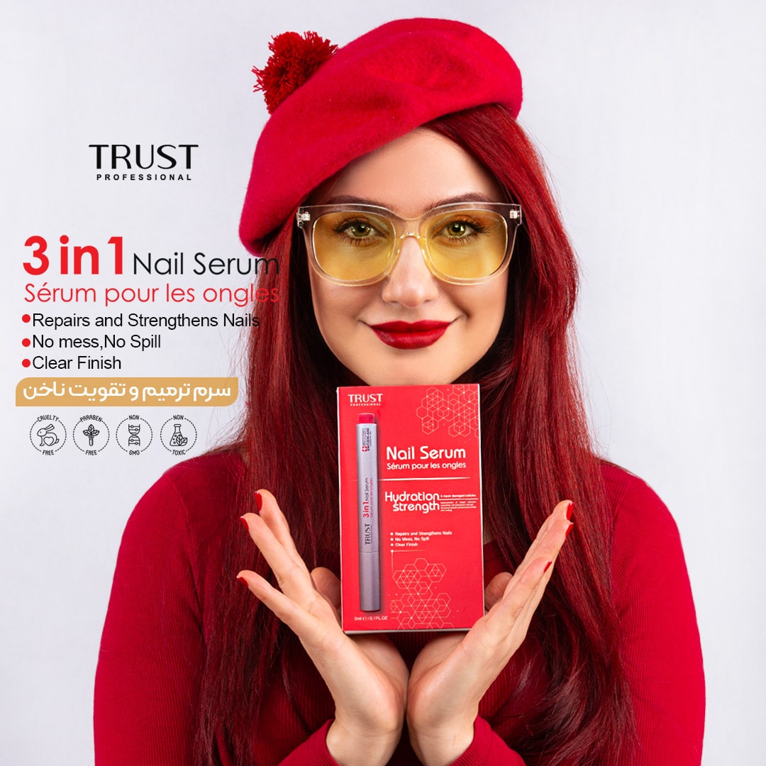 امروزه اکثر مشکلات مربوط به ناخن که شامل شکنندگی، پوسته پوسته شدن ناخن و کوتیکول، بلند شدن صفحهی ناخن، ایجاد برجستگی و یا فرورفتگی در سطح ناخن، رشد نامناسب، عفونت، التهاب و قرمزی بافت اطراف ناخن در اثر آسیب به ماتریکس ناخن و یا کاشت و زیباسازی غیراصولی ناخن ایجاد می شود. بنابراین برای درمان یا رفع مشکلات ناخن میبایست از محصولات مراقبتی استفاده کرد که بتواند ناخنها را ترمیم و مستحکم کرده و یا در صورت وجود عفونت قارچی، به درمان آنها کمک کند. برای درمان شکنندگی ناخنها که با کمبود رطوبت در ناخن ایجاد میشود، میبایست از محصولاتی استفاده کرد که به میزان کافی سطح ناخن را آبرسانی میکنند. کراتین، پروتئین اصلی تشکیل دهندهی صفحه ناخن است. زمانی که به دلایل مختلف میزان کراتین در بستر ناخن کم شود و یا اتصالات بین رشته ها از بین برود، استحکام و یکپارچگی ناخن کم شده و ناخن شکننده یا پوسته پوسته (به اصطلاح پلیسه) میشود. بنابراین استفاده از محصولاتی که ساخت کراتین در ناخن را افزایش دهد، استحکام و سفتی ناخنها را بهبود میبخشد. سرم تقویت کننده ناخن سه در یک تراست با داشتن ترکیبات آبرسان و ویتامینهای موثر، استحکام و رشد ناخن را افزایش داده و به ترمیم آسیبهای کوتیکول کمک میکند. ترکیبات ضد قارچی موجود در این محصول، ضمن بهبود عفونتهای قارچی ایجاد شده در ناخن، التهاب بافت اطراف ناخن را بهبود بخشیده و با حفظ سلامت ناخنها، زیبایی ناخنهای را دو چندان میکند.